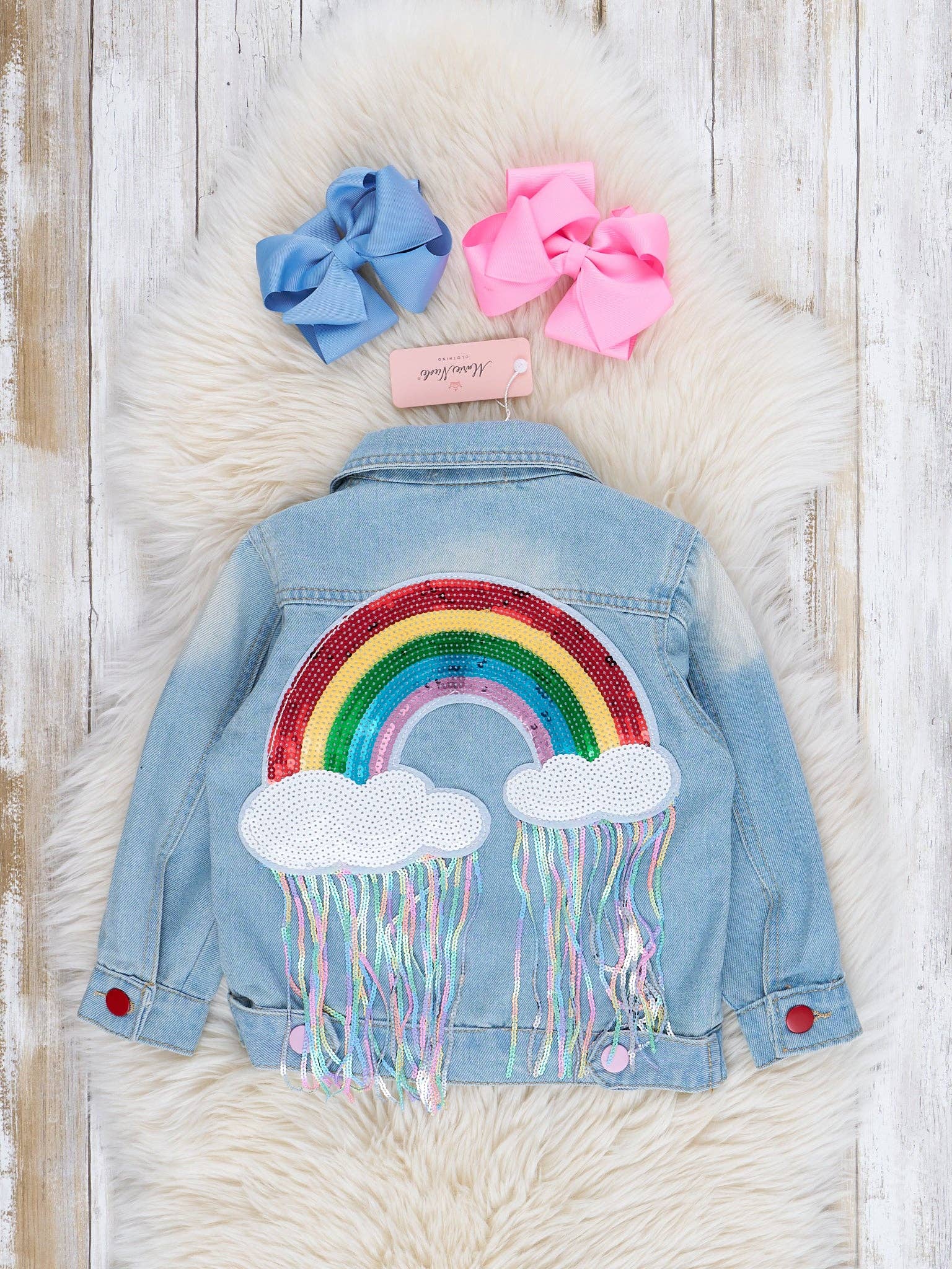We're loving this update by Marie Nicole Clothing to the classic denim jacket featuring the cutest pink and red buttons and sequin rainbow applique. Pop it on top of your favorite dress or leggings for a complete outfit! 🌈