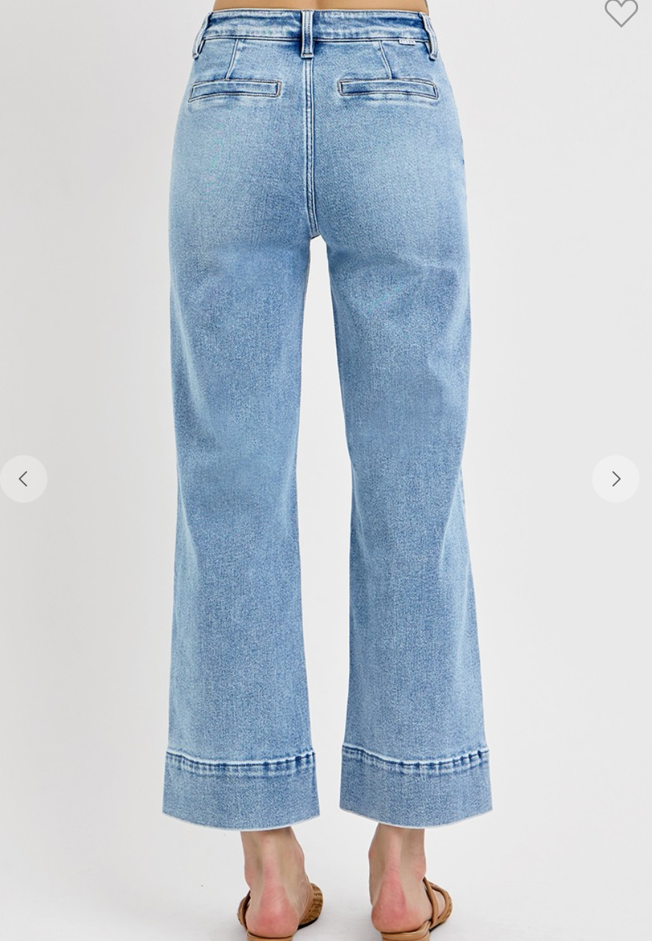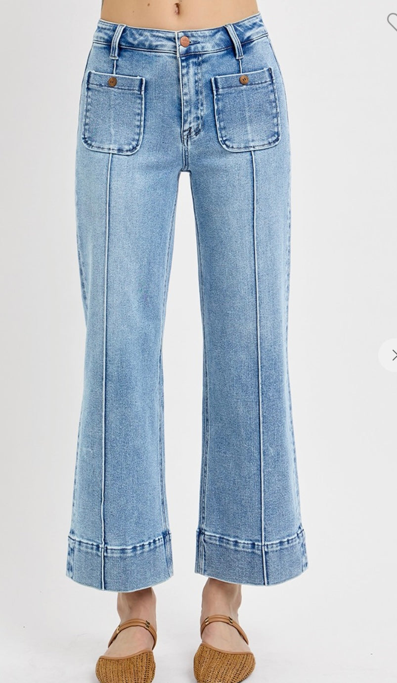 Risen Jeans- Stretch and Comfort allin one! HIGH RISE CROP WIDE JEANS WITH FRONT PINTUCK AND PATCH POCKET DETAILS Rise 10 1/2" Inseam 27"92% COTTON, 5% POLYESTER, 3% SPANDEX