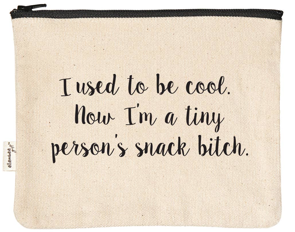 "I used to be cool. Now I'm a tiny person's snack bitch" Our fun yet functional zipper pouches make the perfect gift! They're made of 100% durable cotton canvas, with a black YKK zipper.